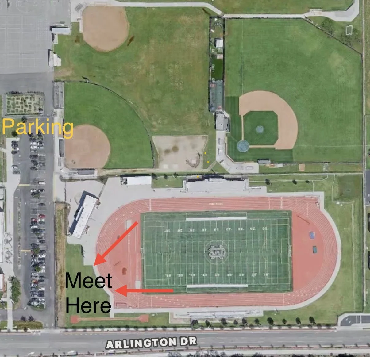 1) Please plan to meet at 7:30 am by the red arrows, especially if your runner is 8 and under. If your runner is older, plan to arrive two hours before their scheduled race.