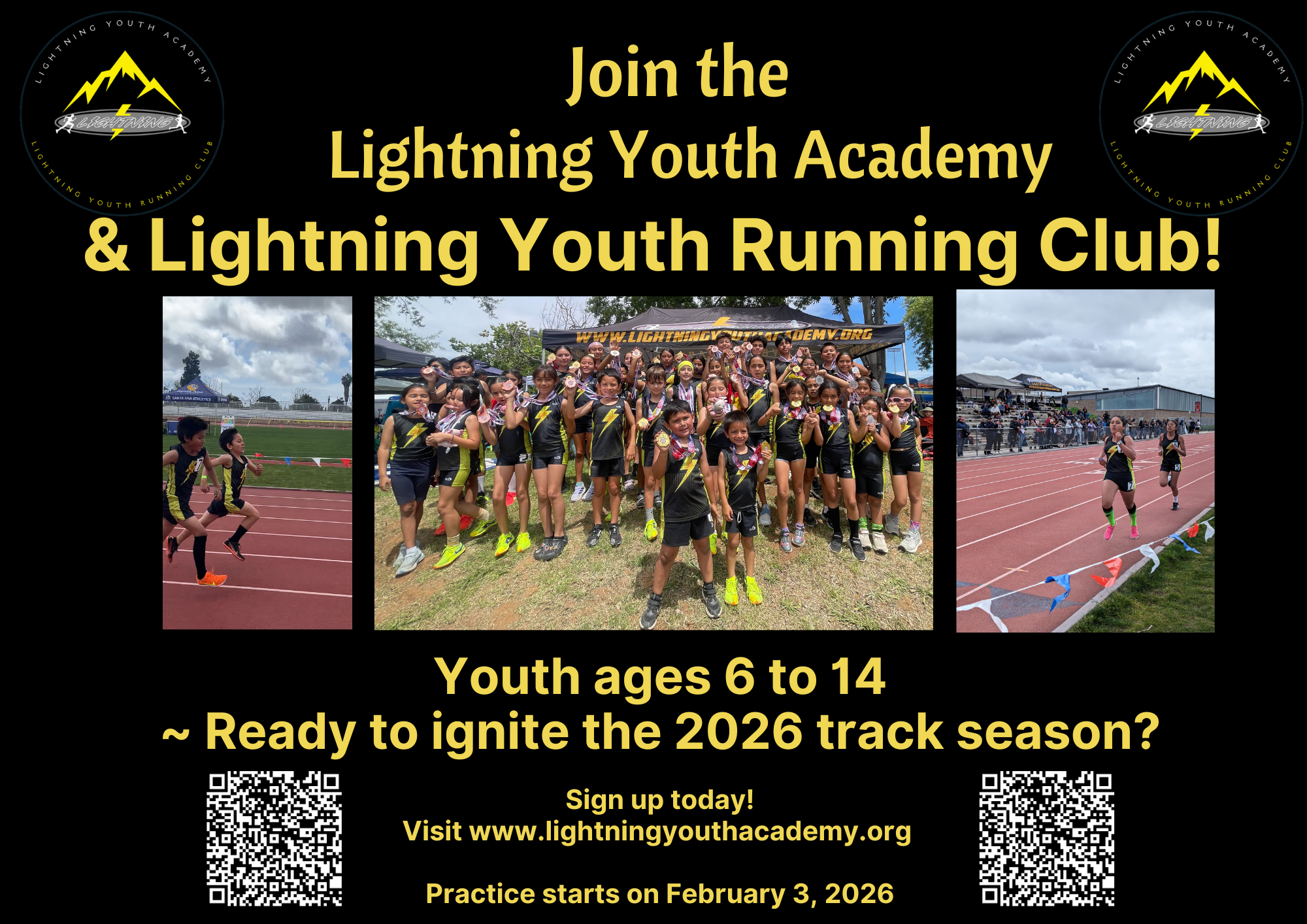 1) Competing: If youth want to be part of the competing team, then the youth will join the Lightning Youth Running Club, and this team practices four days per week at 6:00 pm.