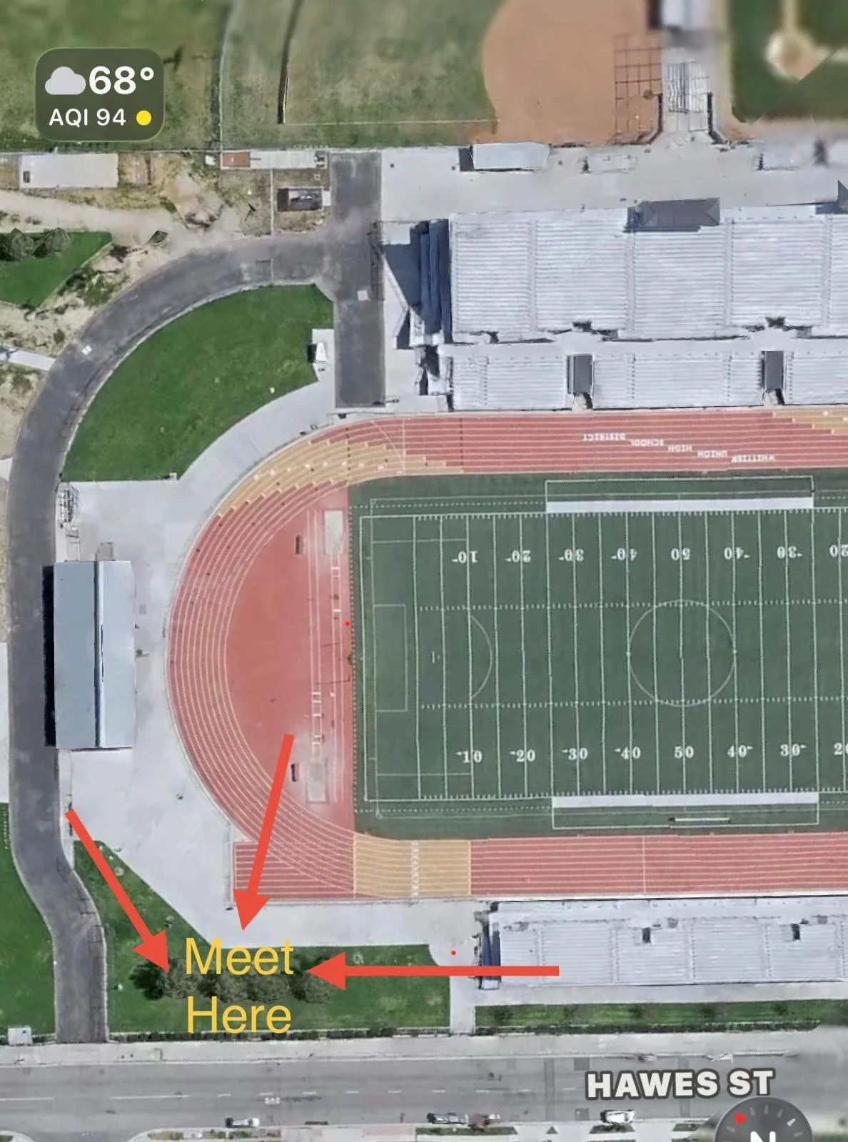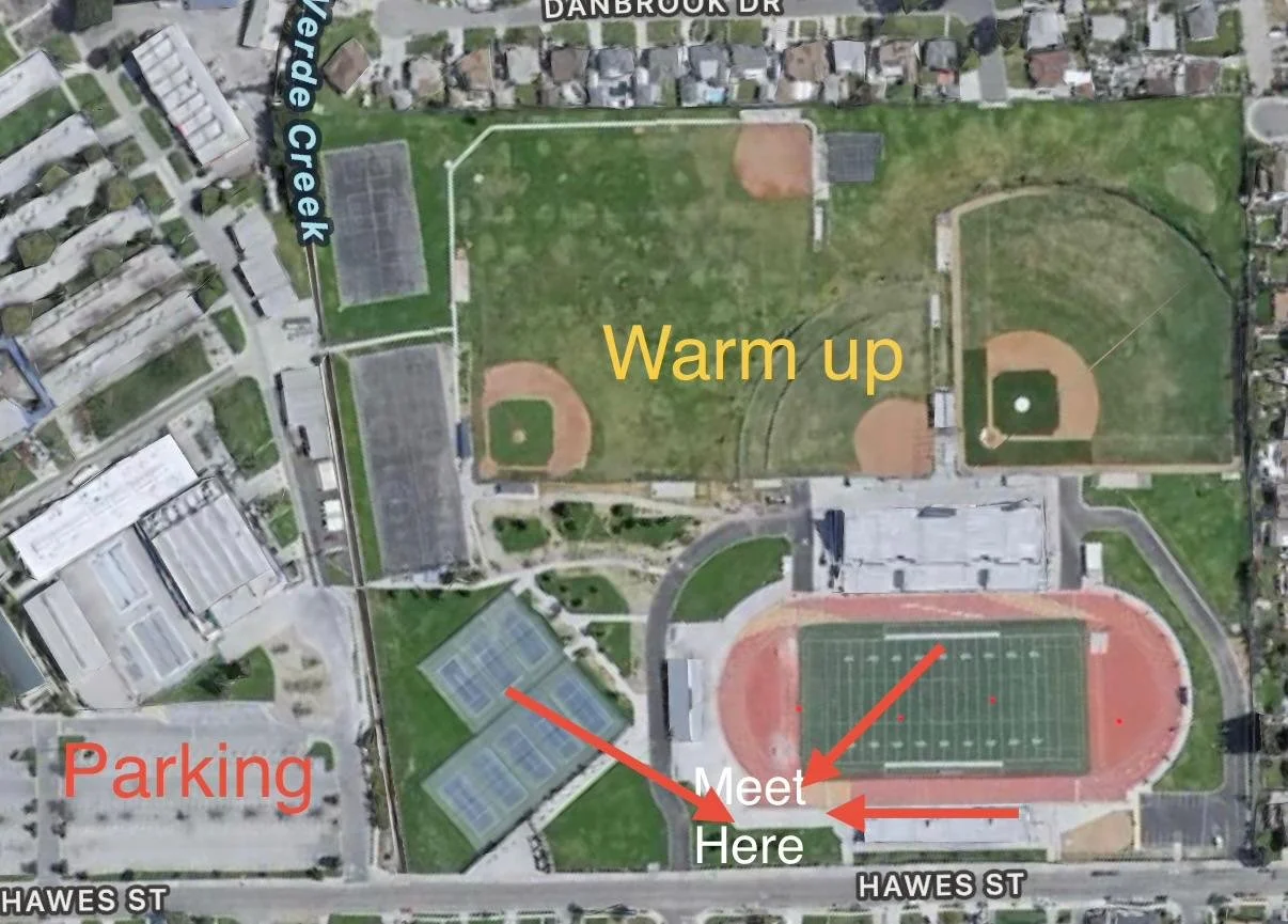1) Please plan to meet at 7:30 am by the red arrows, especially if your runners want to leave early. If your runner will race with their age group, please be there two hours before.